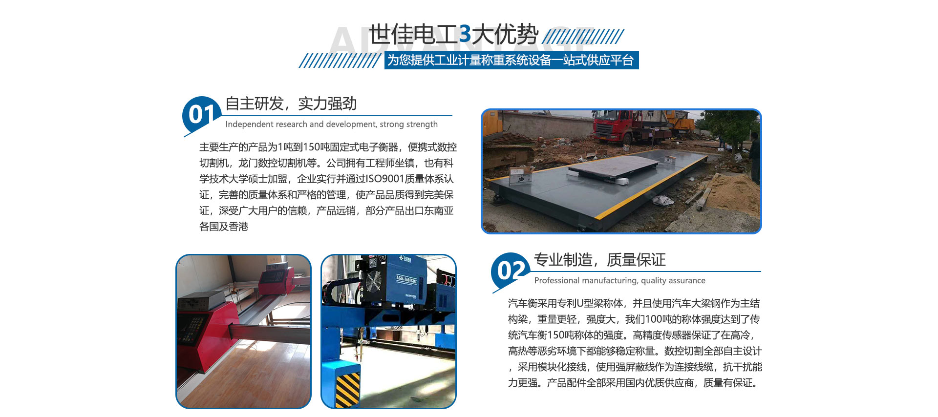 關(guān)于我們合肥世佳電工設(shè)備有限公司是生產(chǎn)、銷售工業(yè)自動(dòng)化設(shè)備。主要生產(chǎn)的產(chǎn)品為1噸到150噸固定式電子衡器,便攜式數(shù)控切割機(jī),龍門數(shù)控切割機(jī)等。公司擁有工程師坐鎮(zhèn),也有中國(guó)科學(xué)技術(shù)大學(xué)碩士加盟,完善的質(zhì)量體系和嚴(yán)格的管理,使產(chǎn)品品質(zhì)得到保證,深受廣大用戶的信賴,產(chǎn)品各地可售,部分產(chǎn)品出口東南亞各國(guó)及香港,數(shù)控切割設(shè)備也在安徽處于前列。我們并不滿足現(xiàn)在所取得的成就,公司繼續(xù)加大科研投入,正在和中科大物理研究所科研人員共同研究開發(fā)下一代衡器控制儀表,希望以技術(shù)作為突破口,將公司做大做強(qiáng),為中華崛起盡自己一份綿薄之力。歡迎廣大客戶來廠參觀訂貨考察。